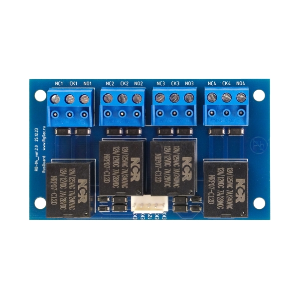 Модуль RB-04 значительно расширяет возможности подключения к контроллерам RusGuard сторонних приборов и устройств. Благодаря RB-04 выходы EK5–EK8 контроллера RusGuard могут управлять оборудованием с напряжением до 220V и током до 10А.