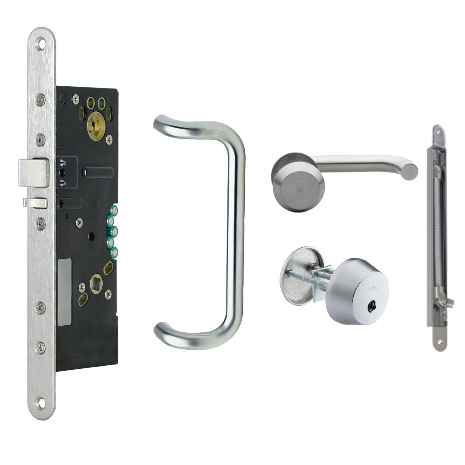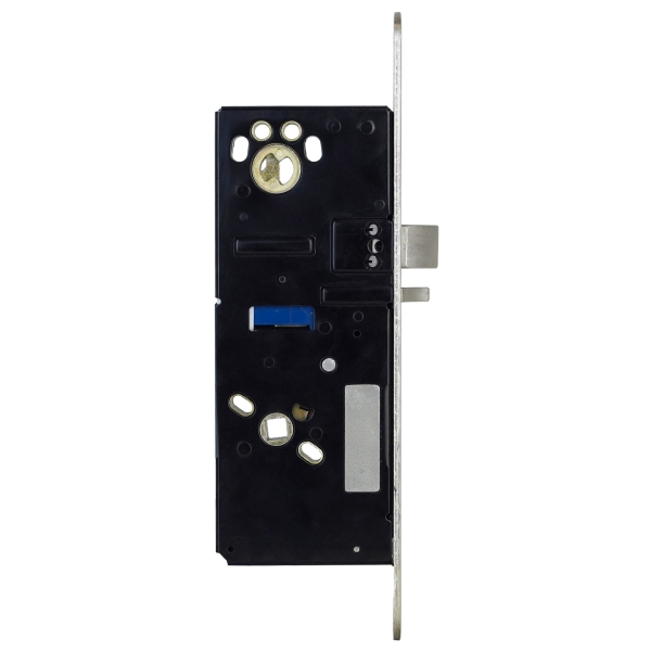 - Совместимость с фурнитурой Abloy. Замок имеет размеры и технологические отверстия, точно соответствующие замку EL595FU, поэтому к нему подходят цилиндровые механизмы, ручки, нажимные штанги и ответные планки от финского производителя.