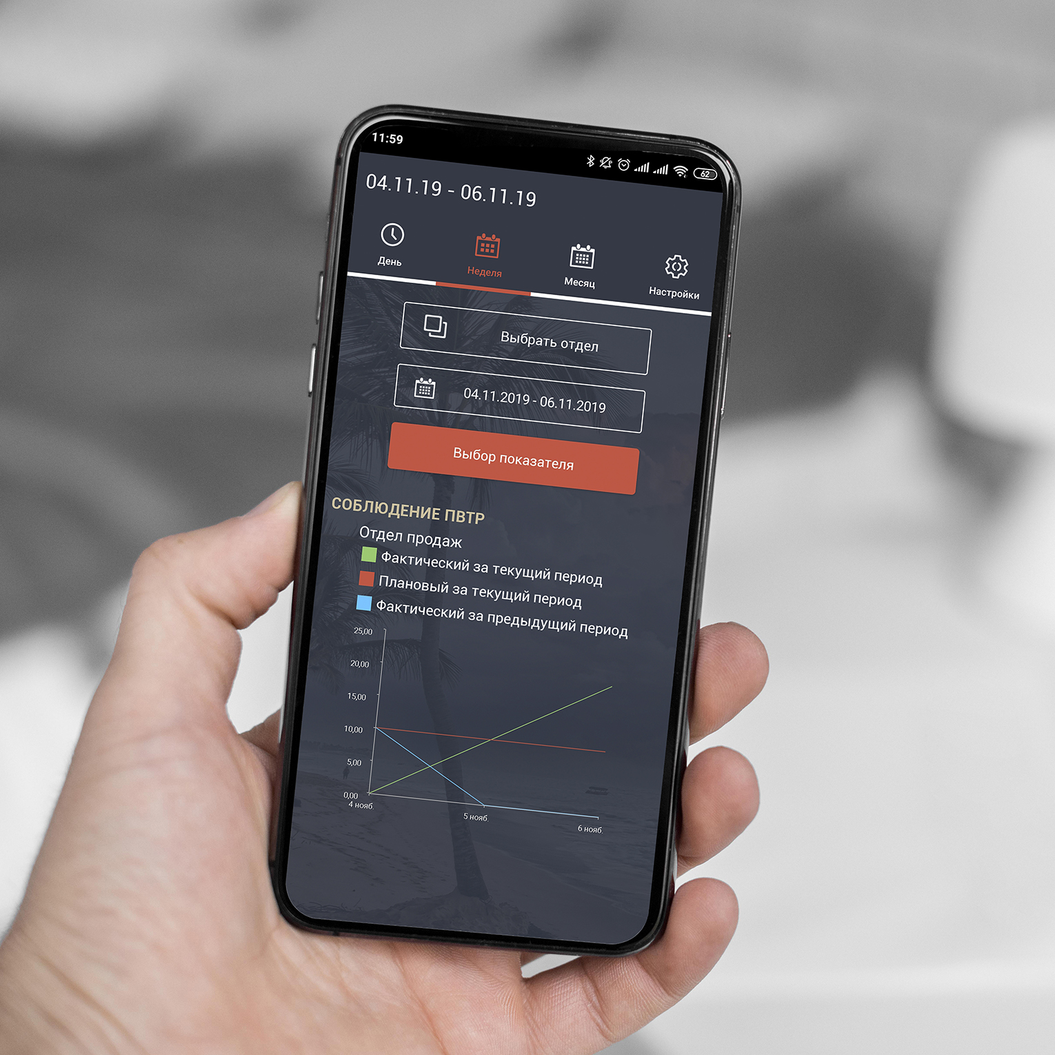 После установки мобильного приложения на смартфон, топ-менеджер может посмотреть отчетность на экране, отображаемую в виде наглядного графика с ключевыми цифрами, выделенными цветом.