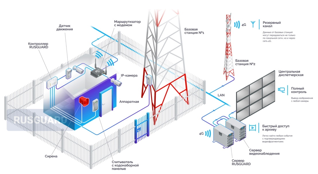 СКУД RusGuard интегрируется с другими системами безопасности объектов: видеонаблюдением и охранной сигнализацией. Информация от датчиков движения передается на объектовый контроллер. При нарушении охраняемого периметра контроллер отправляет тревожное извещение на АРМ оператора системы для принятия необходимых мер. Видеоинформация записывается и сохраняется для просмотра персоналом мобильного оператора.