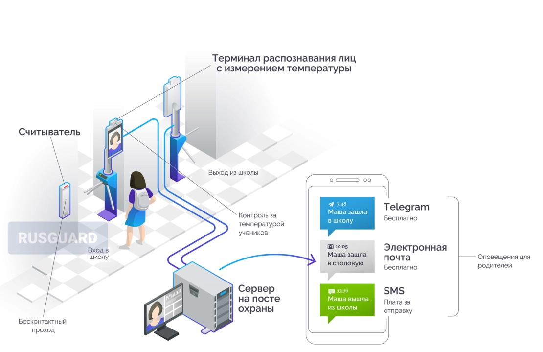 - Система регистрирует прибытие и убытие каждого ученика, фиксирует этот факт в базе данных и отправляет уведомления родителям через мессенджеры или СМС.