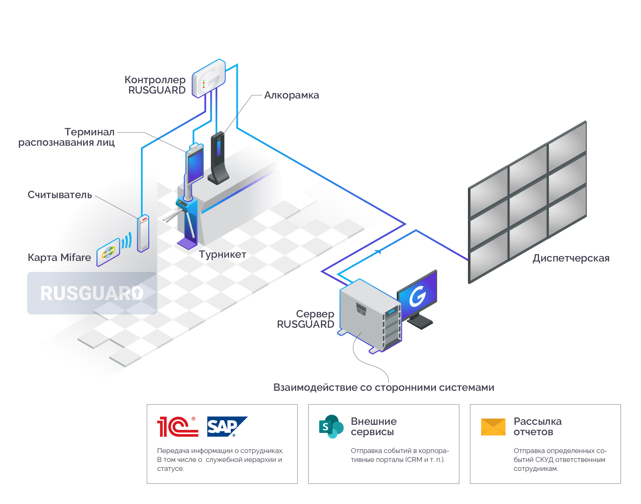 СКУД RusGuard легко интегрируется с другими системами безопасности промышленного предприятия. Возможна интеграция с системами видеонаблюдения и охранно-пожарной сигнализации для обмена информацией и своевременного реагирования на нештатные ситуации.